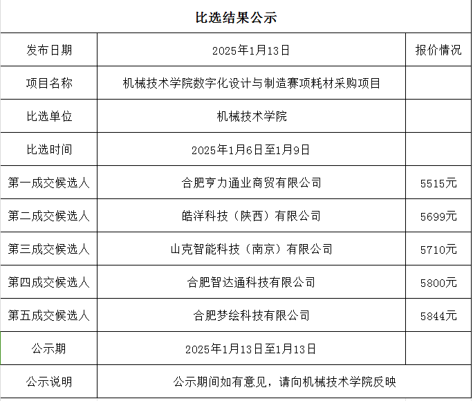 机械技术学院数字化设计与制造赛项耗材采购项目比选结果公示