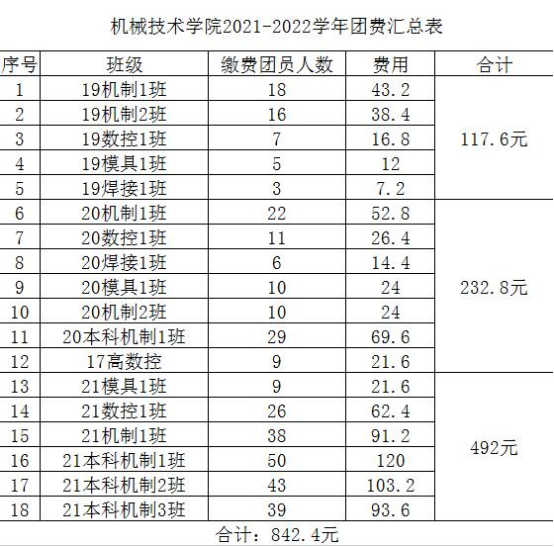 机械技术学院2021-2022学年团费收缴公示