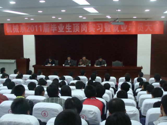 2010年10月28日晚七点三十分,机械工程系于学术报告厅召开2011届毕业生顶岗实习暨就业动员大会。参加会议的主要人员有:系主任黄道业、党总支书记束传俊、副书记孙武、副主任朱修传以及08级各班班主任。会议由孙书记主持。