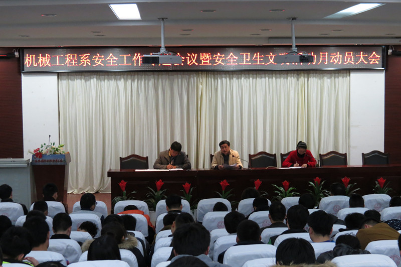 根据院机械党总支函[2014]21号文件精神,新学期为增强全系学生“安全、卫生、文明”意识,我系3月13日下午在图书馆报告厅召开新学期安全工作专题会议暨安全卫生文明活动月动员大会,系属各班各班主任、班长、寝室长参加会议,会议由团总支书记孙策主持,党总支书记吴方庭、党总总支副书记陈思参加了会议。