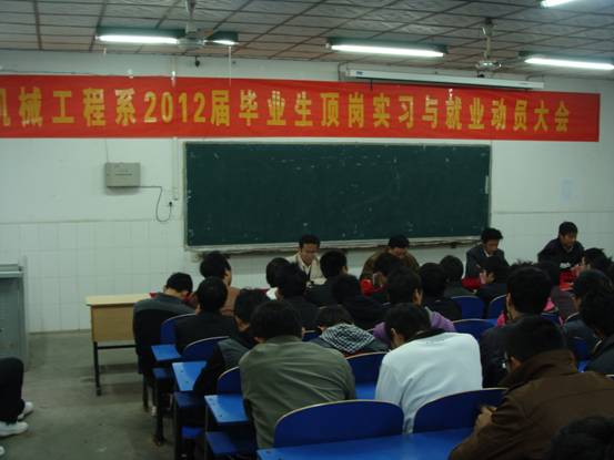2011年10月28日下午4时整,机械工程系在1号教学楼111室召开2012届毕业生顶岗实习暨就业动员大会。系主任黄道业、党总支副书记束传俊、孙武、09级辅导员孙策及2012届部分毕业生参加会议,会议由孙武副书记主持。