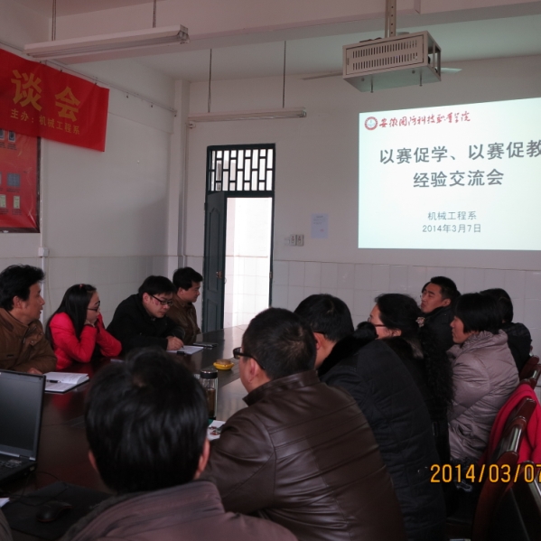 为进一步提升职业技能大赛引领制造类专业技术技能型人才培养水平,机械工程系于3月7日下午在系会议室召开以赛促学、以赛促教经验交流会,会议由系主任束传俊主持,系党总支书记吴方庭、副主任李存鹏、系属2014年省级职业技能大赛各参赛队指导老师参加会议。