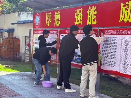志愿劳动服务中,学生志愿者们手持抹布,细致的擦拭着校园内的每一处玻璃和橱窗框架,努力营造出美丽清洁的校园文化环境。