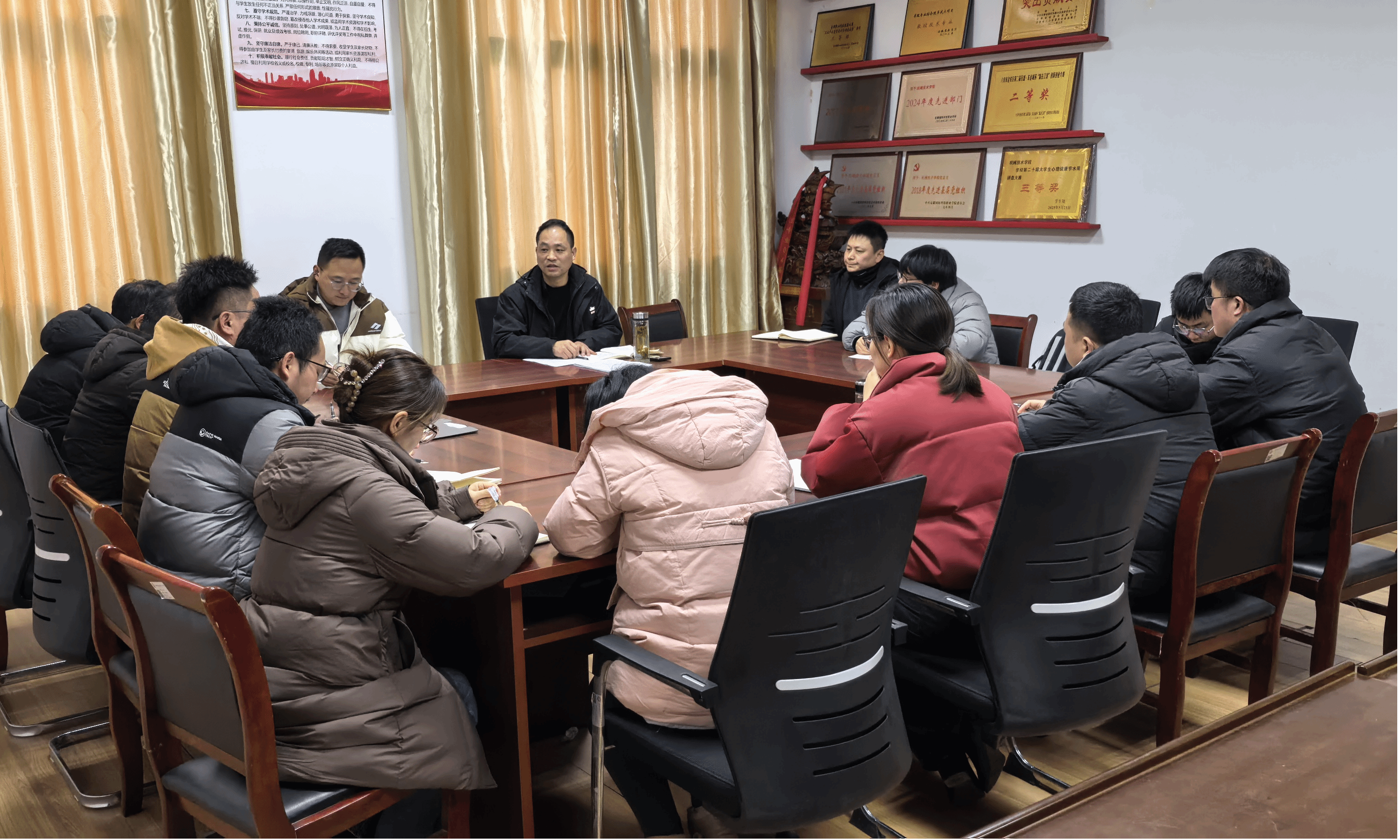 会议对期初各项重点工作进行统筹安排、系统部署:一是抓实常规管理,要求辅导员全面摸排学生返校情况,有序做好教材领取、学期注册、优秀毕业生推荐、走读手续办理及文明宿舍评比等工作;二是强化团学引领,坚持提高政治站位、规范工作程序,精心组织开展爱国主义主题教育、升旗仪式,扎实落实学生干部培训等工作;三是聚焦重点任务,稳步推进“一站式”学生社区建设、常态化开展安全教育,重点筑牢防范网络诈骗、宿舍消防安全和心理健康教育等安全防线。