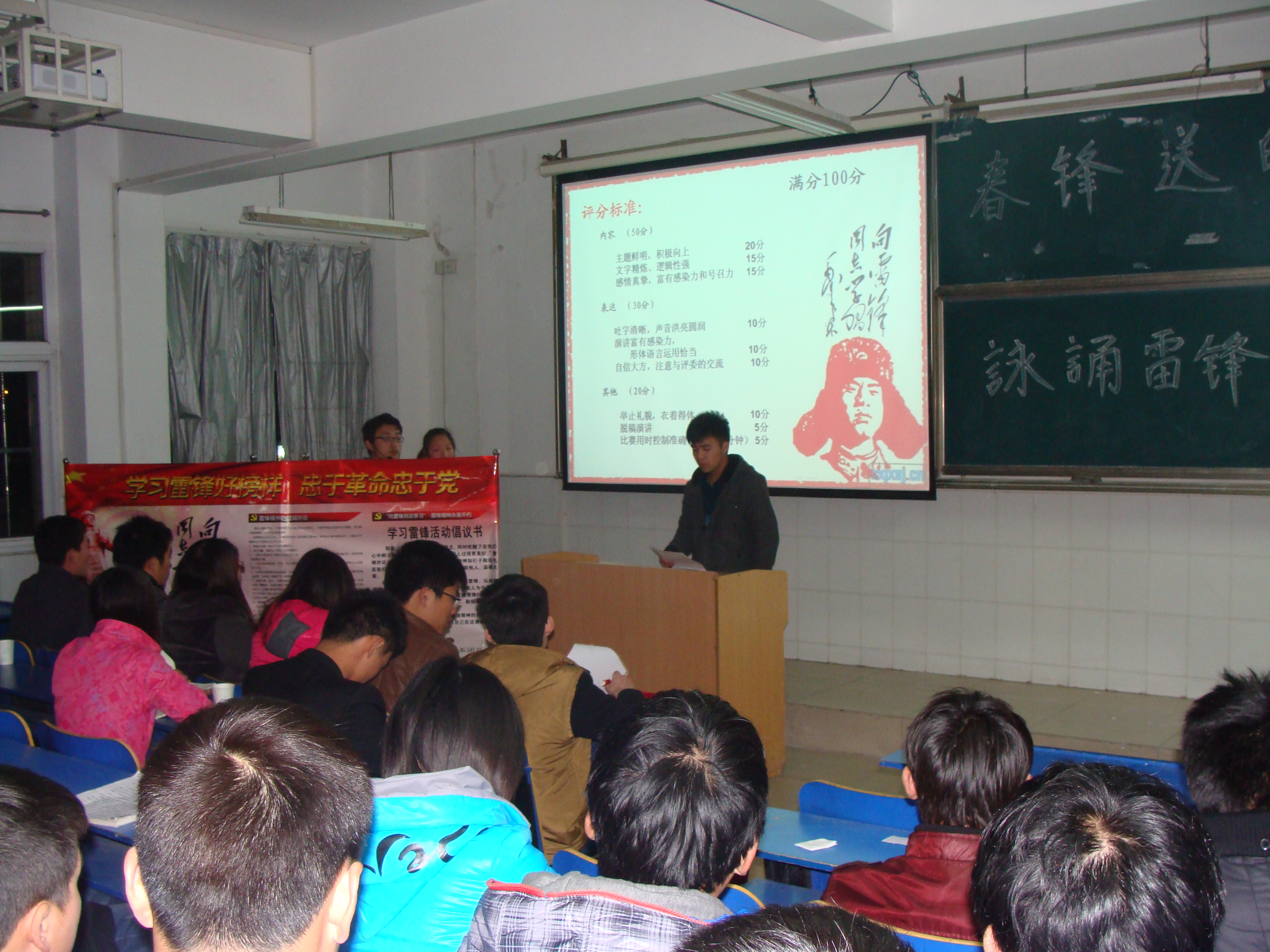 为弘扬时代主题,传承雷锋精神,在“雷锋月”活动期间我系于3月14日晚在2栋105教室举办了“弘扬雷锋精神配乐诗朗诵”决赛。据悉此次活动于3月12日进行了初赛,在60名参赛选手中共有16名选手脱颖而出进入本场决赛。