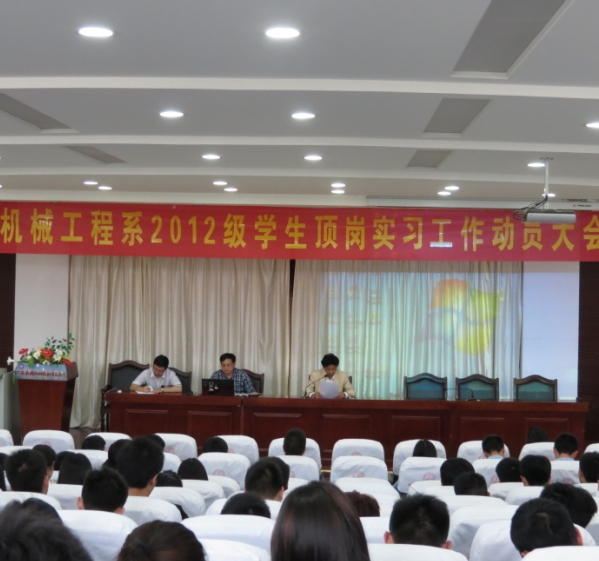 2014年5月7日下午4时30分,机械工程系在院图书馆报告厅召开2012级学生顶岗实习工作动员大会。系主任束传俊、党总支书记吴方庭、辅导员张艳华及2012级班主任和近200名学生代表参加会议,会议由系副主任李存鹏主持。