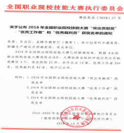 在2018年全国职业院校技能大赛中,黄祥老师作为大赛工作人员,由于业务娴熟、工作细致、善于沟通,根据《全国职业院校技能大赛奖惩办法》,被大赛执委会评选为优秀工作者。
