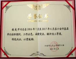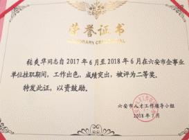 2018年,张爽华老师在企业挂职期间表现优秀,工作出色,成绩突出,荣获六安市人才工作领导小组颁发的二等奖荣誉证书。本届优秀高校挂职专业技术人才奖共评出一等奖2名,二等奖3名,三等奖5名。