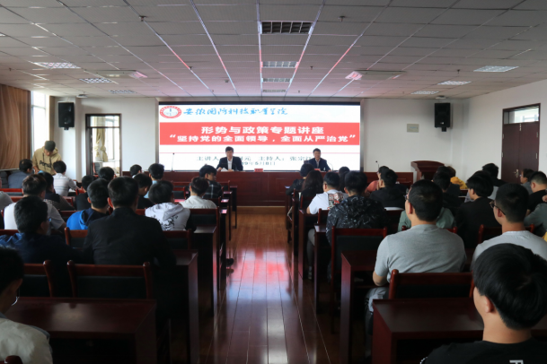 为全面贯彻落实高校大学生思想政治工作会议精神,由校思政部主办、机械技术学院承办的“形势与政策”系列讲座“坚持党的全面领导,全面从严治党”专题报告,5月8日下午,在综合楼12楼报告厅召开。思政部全体教师、机械技术学院师生代表近150人参加了报告会,报告会由校党委书记余嗣元主讲,机械技术学院党总支书记张宗江主持。