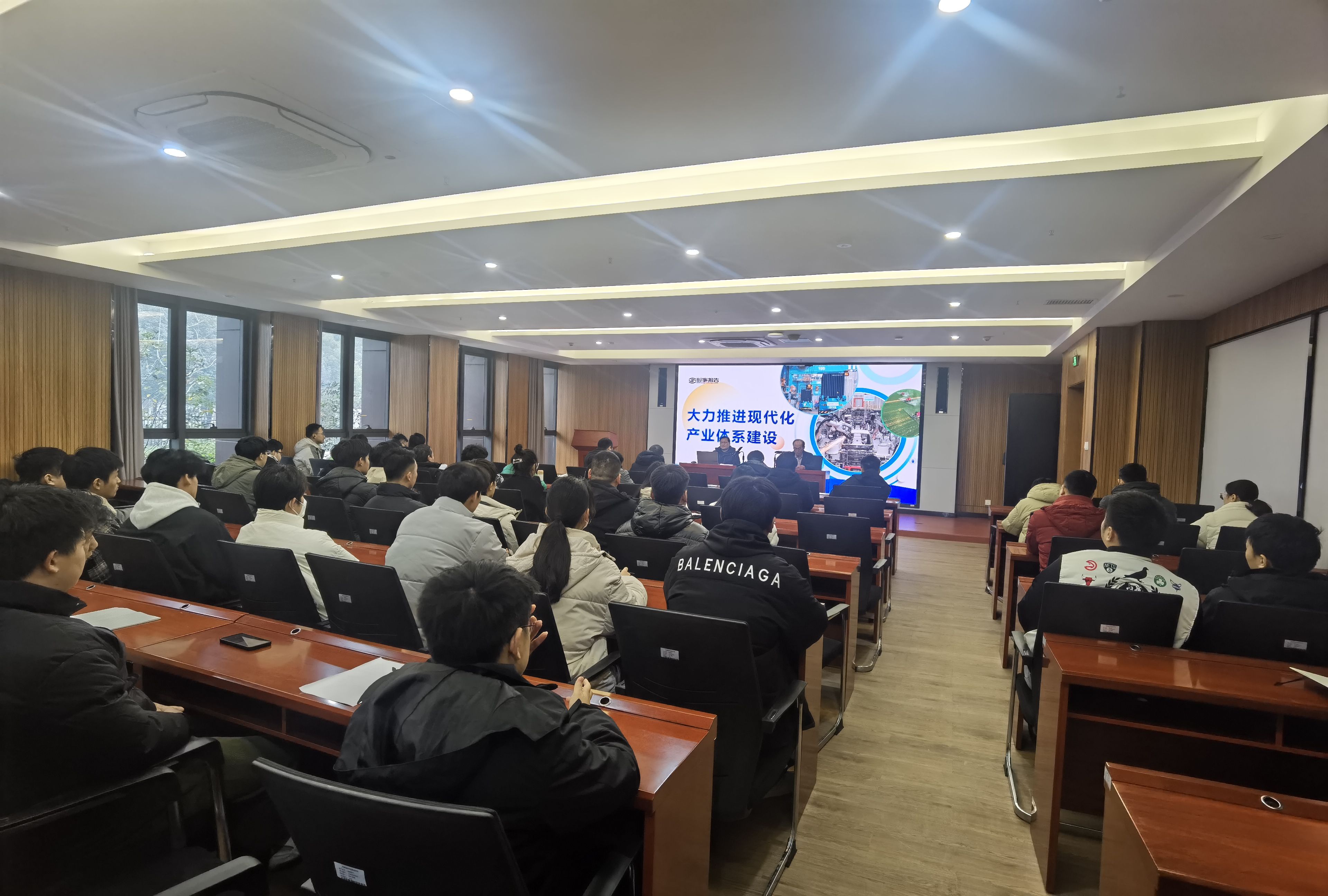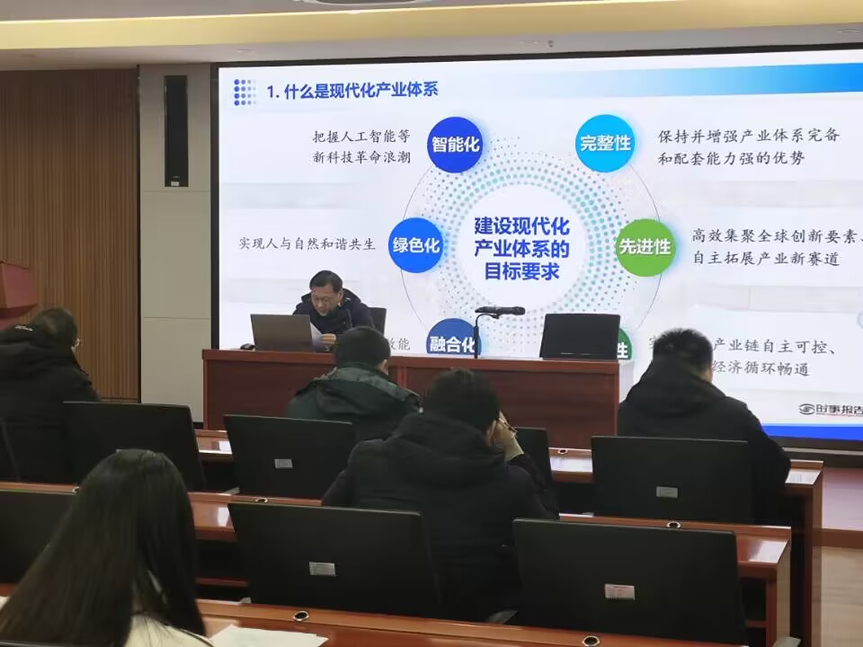 徐正红从“把握现代化产业体系的深刻意蕴”“认清产业体系建设的现状与挑战”“推进现代化产业体系建设着力点”三个方面,全面阐释了现代化产业体系的整体布局、重大意义、建设现状、主要举措。他要求同学们,一要深刻认识到加快现代化产业体系建设是时代所需、发展所需,是我国构筑未来发展战略优势的重要支撑;二要认识到进入新发展阶段,全面建设社会主义现代化国家,提高经济实力和科技实力,必须紧紧抓住产业现代化这个关键,夯实现代化产业体系这个物质技术基础,通过打造完整而有韧性的产业链供应链,把产业安全、经济安全、国家安全牢牢掌握在自己手中。
