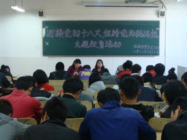 10月31号下午,机械工程系党总支学生党支部在2栋108教室进行了“保持党的纯洁性,迎接党的十八大”主题教育活动,活动的主要内容是学习张宝顺在全省“保持党的纯洁性、迎接党的十八大”教育实践活动动员讲话精神。该系2010级、2011级学生党员参加了此项活动。