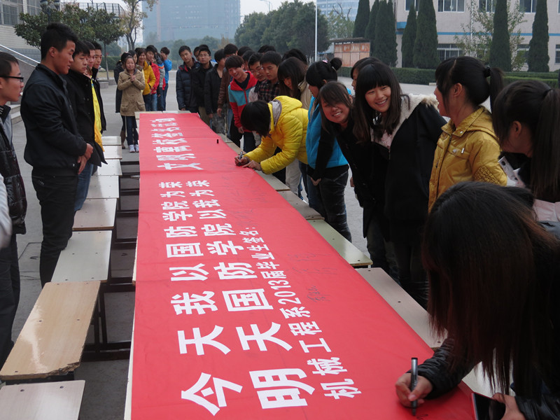11月20日下午,机械工程系在二栋教学楼前举办了以“今天我以国防学院为荣,明天国防学院以我为荣”的2013届毕业生文明离校主题签名活动。