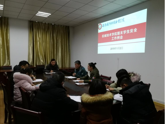 (机械技术学院张艳华) 为确保期末学生工作顺利开展,将学生安全工作长抓不懈,1月2日下午,机械技术学院召开学生安全工作例会,布置寒假前后学生相关工作,并着重强调学生安全工作。会议由院党总支书记张宗江主持,院党总支副书记陈思、全体辅导员和17、18级班主任参加了会议。