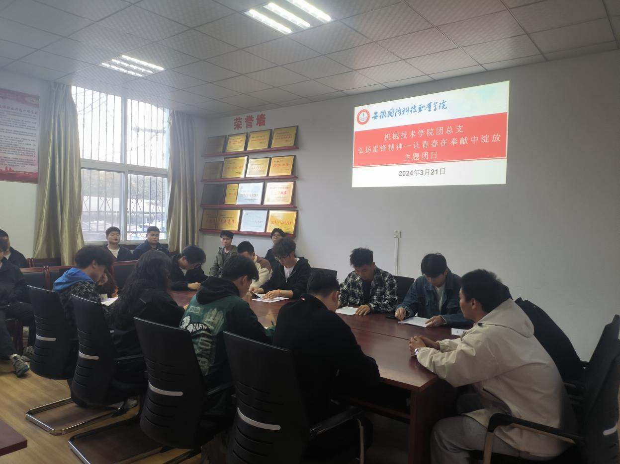 本网讯(学生通讯员 彭章雨)为深刻把握雷锋精神的时代内涵,让雷锋精神在新时代绽放更加璀璨的光芒。3月21日机械技术学院学生会功能性团支部在知行楼120会议室开展“弘扬雷锋精神——让青春在奉献中绽放”主题团日活动。本次会议由团支部书记周能能主持,校学生会兼职副书记汪波出席本次主题团日活动。