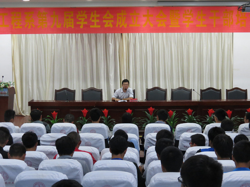 2013年10月9日下午,机械工程系在图书馆报告厅召开第九届学生会成立大会暨学生干部培训会。系党总支书记吴方庭、党总支副书记陈思、团总支书记孙策、11级辅导员杨静、12级辅导员张艳华、13级辅导员李从东及第九届学生会全体学生干部参加会议。