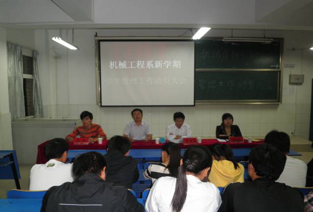 2011年9月26日下午6时40分,机械系团总支学生会换届大会在教二楼105教室顺利举行。系党总支副书记束传俊、党总支副书记孙武、2011级辅导员杨静、机械工程系第七届团总支学生会全体成员出席了大会。会议由杨静老师主持。