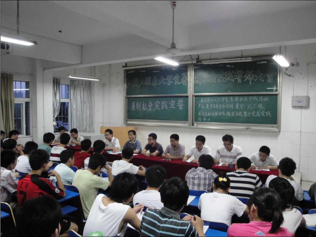 6月30日晚,机械工程系在2栋105教室召开大学生暑假社会实践誓师大会,机械工程系党总支书记夏世林、院团委副书记李存鹏、各队带队指导教师和各班暑期社会实践学生参加大会。