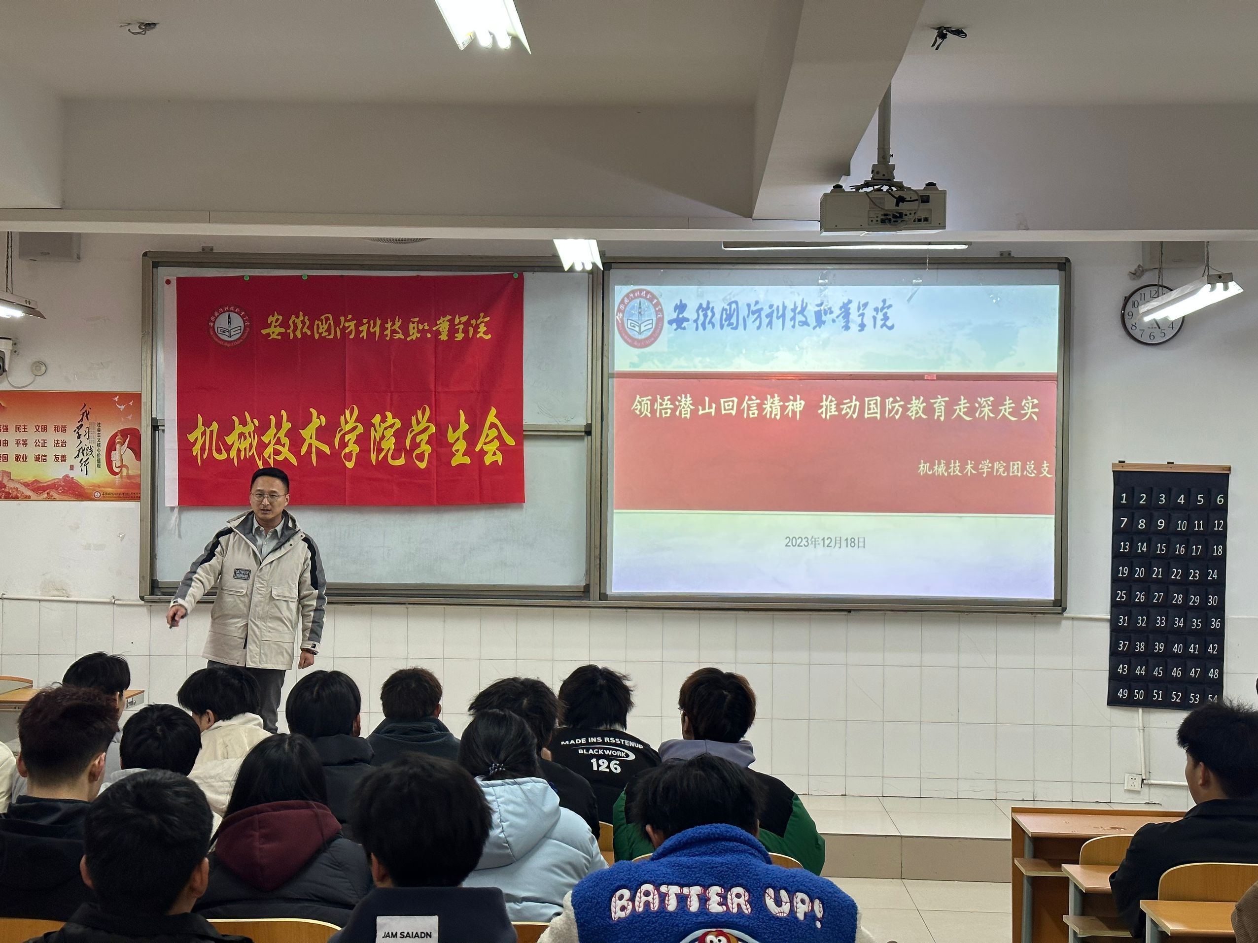(学生通讯员:周能能)为深入传达学习习近平总书记给潜山野寨中学新考取军校的同学们的重要回信精神,同时实现团干部常态化、制度化直接联系、服务、引导青年,12月18日,机械技术学院团总支王腾州老师与其直接联系的22机制1班全体同学开展学习贯彻习近平总书记重要讲话精神主题团课。