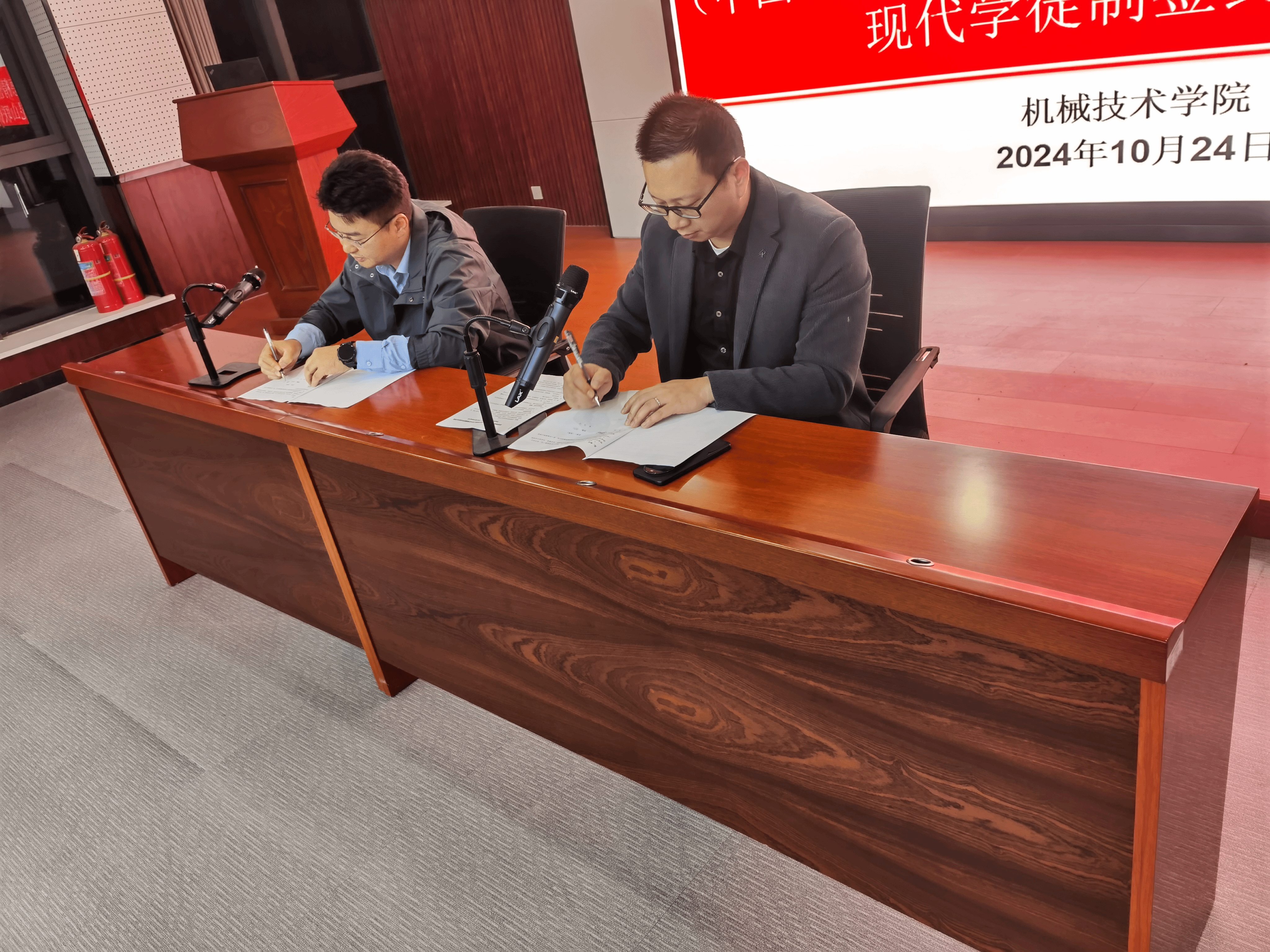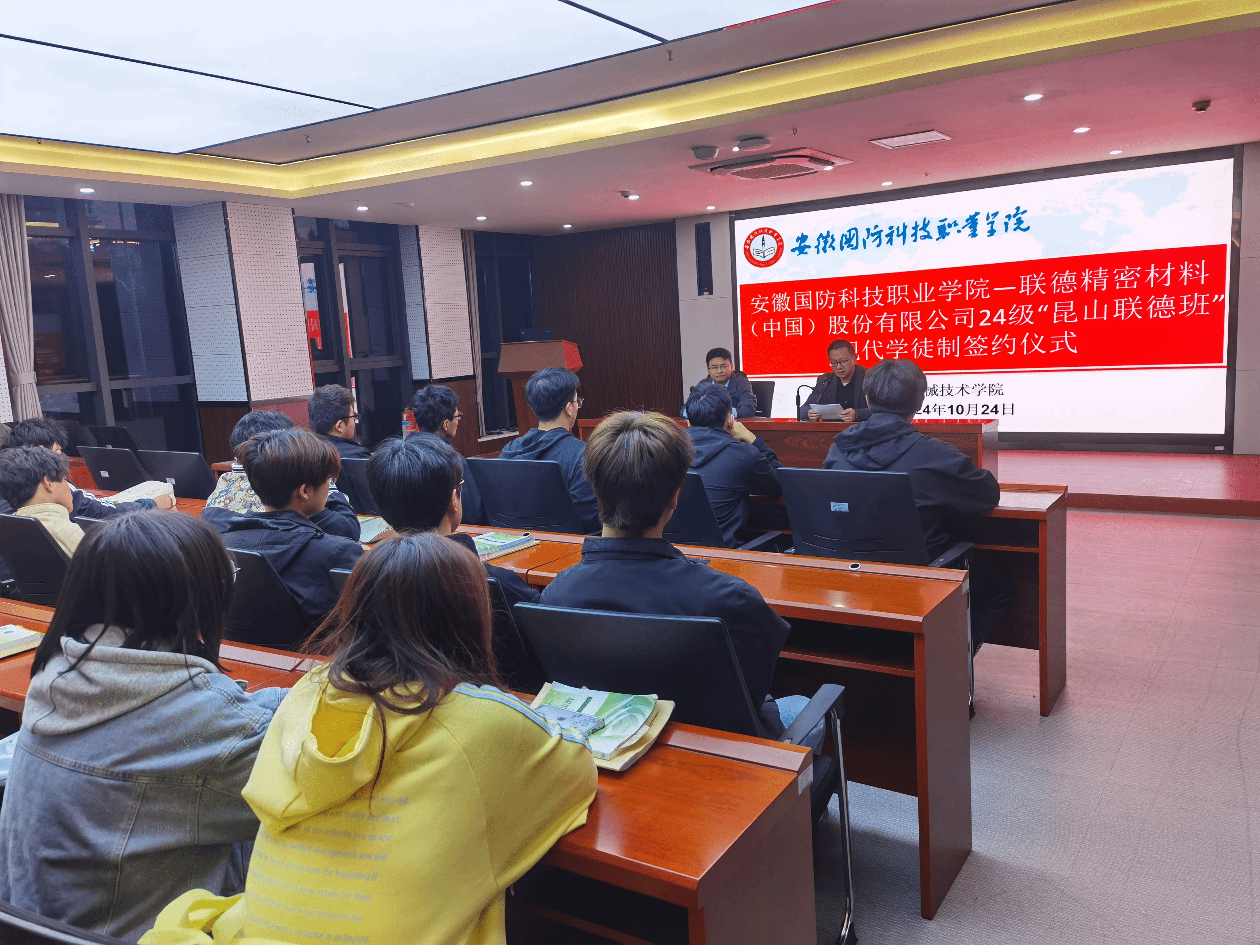 (机械技术学院 姚海凌)为加强校企联合,促进资源优势互补,探寻工学结合的新模式,本着平等、合作、共赢的原则,经双方协商,就开办“联德班”现代学徒制人才培养合作达成共识。10月24日,机械技术学院副院长熊良平与联德精密材料(中国)股份有限公司人事部部长康世杰及24级模具设计与制造专业全体学生在产教融合中心第二报告厅举行现代学徒制班签约仪式。