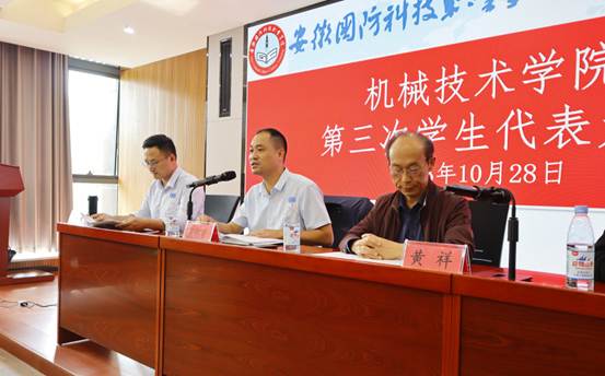 (机械技术学院 王腾州)2023年10月28日上午8:30点,机械技术学院在产教融合中心第一报告厅召开第三次学生代表大会。出席本次大会的有我院党总支书记兼院长黄祥,副书记张红军,第十九届学生会主席朱铭志,此次大会由团总支书记王腾州主持。