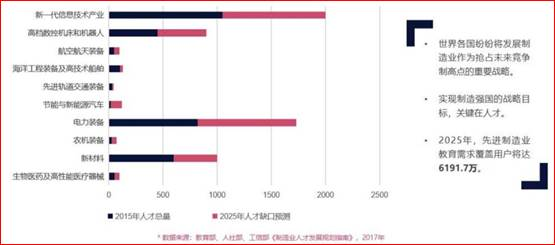 1、专业人才需求量大,据国家《制造业人才发展规划指南》预测,到 2025 年,我国制造业十大重点领域人才需求量为 6000 万,人才缺口达 3000 万。