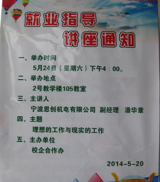 5月24日,我院在2号教学楼105多媒体教室隆重举行大学生就业指导讲座,宁波思创机电有限公司副总潘华章担任主讲。宁波思创机电有限公司总经理张光军和就业指导科科长柳春老师以及我院150多名师生参加了讲座。