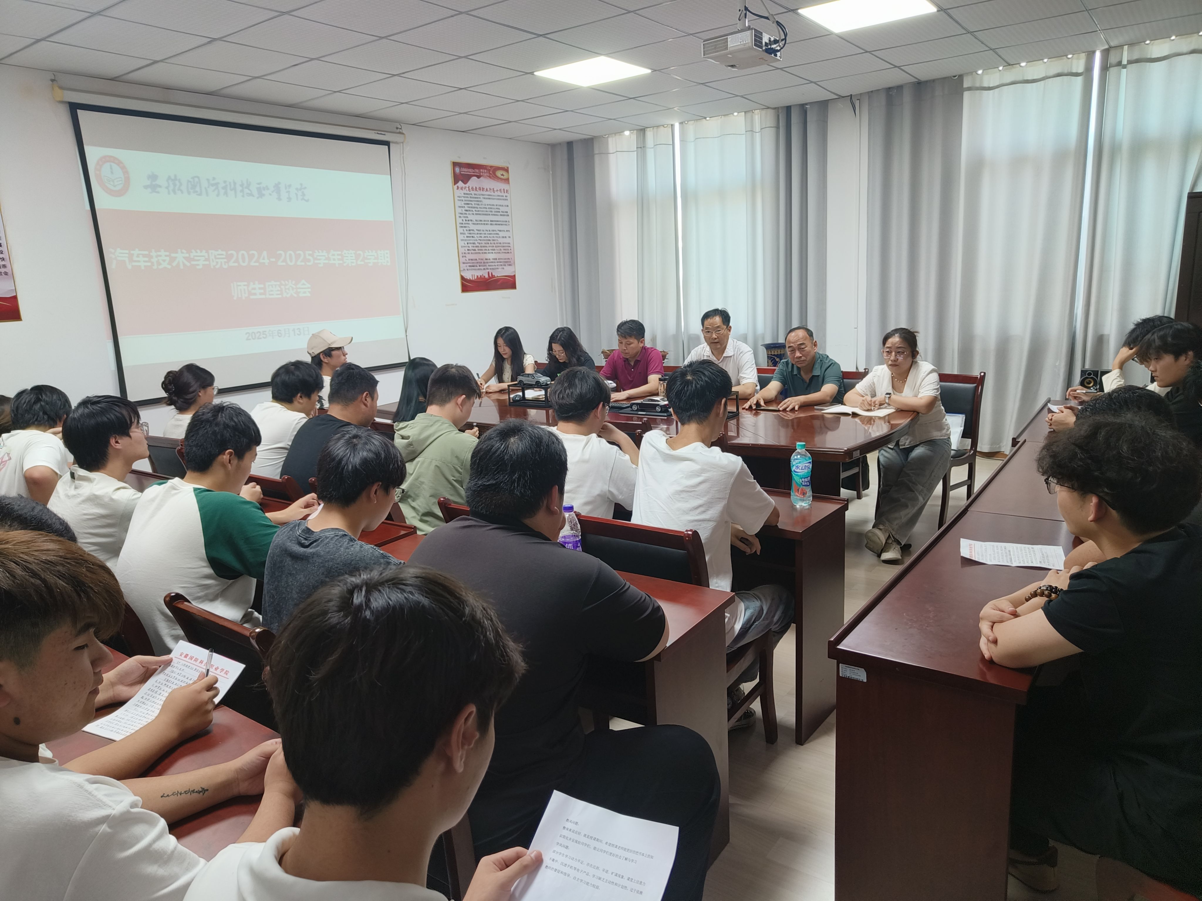 本网讯 为充分了解广大学生对学校教育教学、管理服务等方面的意见和建议,提高学院教学管理服务水平和教学质量,6月13日下午,汽车技术学院召开2024-2025学年第2学期师生座谈会,学院党政办班子主要成员,实训中心、教研室、团学工作负责人等与各班学生代表畅谈交流。