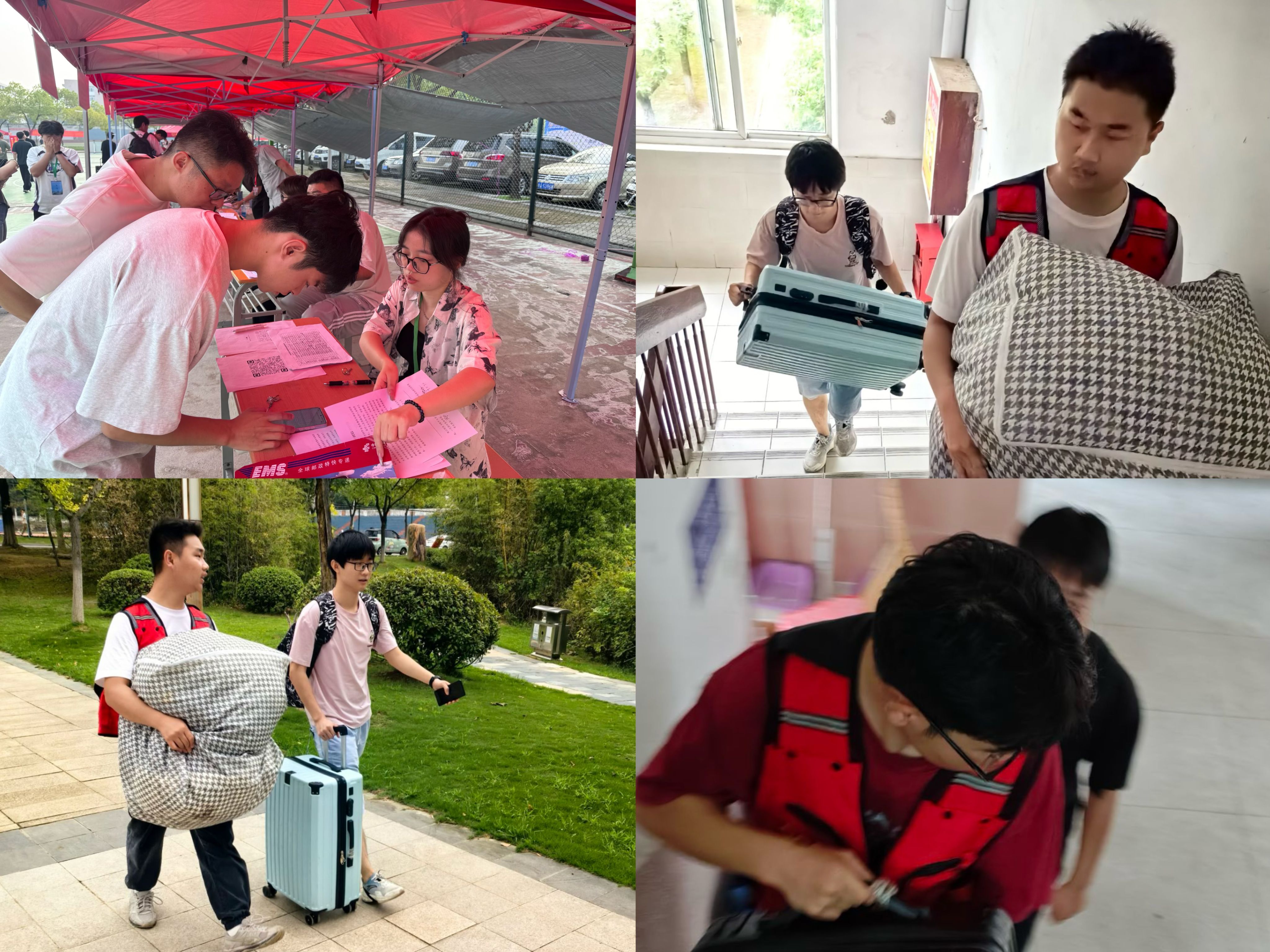 迎新现场,高举汽车技术学院指示牌的志愿者热情洋溢地为新生指引方向、提供问询服务;身穿红马甲的志愿者用有力的双手接过新生的行李,报到处志愿者有条不紊地登记新生信息、分配寝室钥匙,报到流程便捷高效;专业咨询处老师热心、耐心解答家长及学生的专业问题。