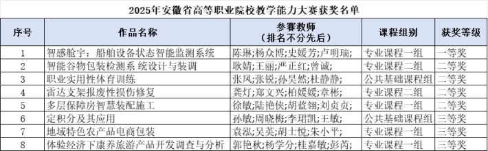本网讯 近日,安徽省教育厅公布了2025年安徽省高等职业院校教学能力大赛获奖名单,万象城官网参赛教师凭借良好综合素养,先进教学理念,斩获一等奖1项,二等奖4项,三等奖3项。