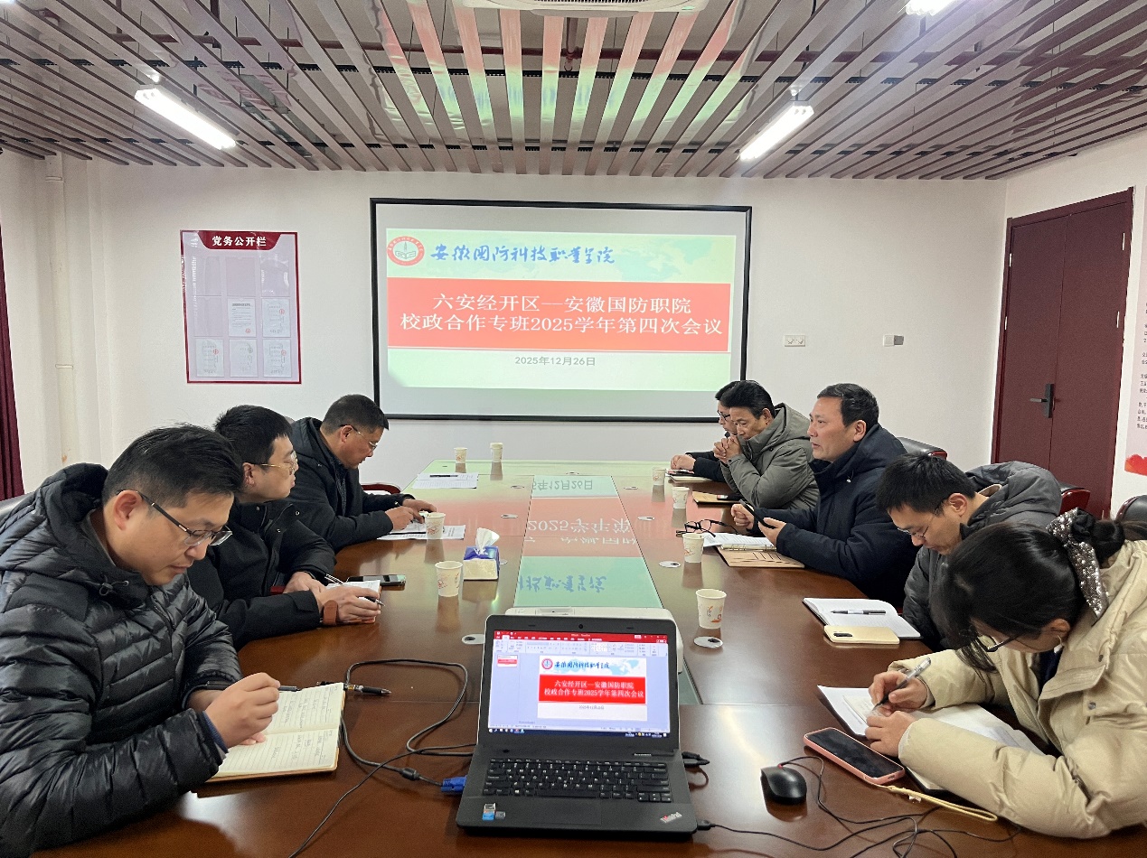 12月26日下午,六安经开区-万象城体育awcsport政校合作专班2025年度第四次工作会议在产教融合中心四楼A401会议室召开。校企合作办主任李中永主持会议,六安市经济开发区人才就业服务中心副主任朱含超及其他专班成员参会。