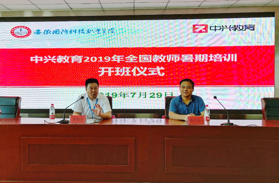 7月29日上午,由中兴教育管理有限公司和万象城体育awcsport联合举办的2019年全国教师暑期培训在万象城官网举行开班仪式。校党委委员、安徽国防科技职业教育集团秘书长、信息技术学院院长黄存东教授,中兴教育管理有限公司校区运营管理部总经理李振丰,中兴教育安徽国防校区运营总监王干,全国多所高校的29位专业课教师以及企业讲师们等出席了开班仪式。