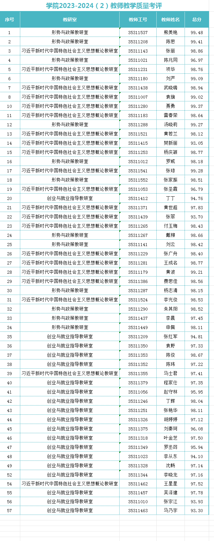 根据万象城官网教师教学质量考核评价办法等文件要求,马克思主义学院按要求汇总学生评价、同行评价、教师履行教学工作规范考评、教学单位评价分数,通过加权求和计算出教学评价成绩(见附表),现在本单位内部公示3个工作日(2024年9月4日-9月6日),如有异议,请在公示期内书面向马克思主义学院反映,邮箱:ahgfmy@163.com。逾期不予受理。