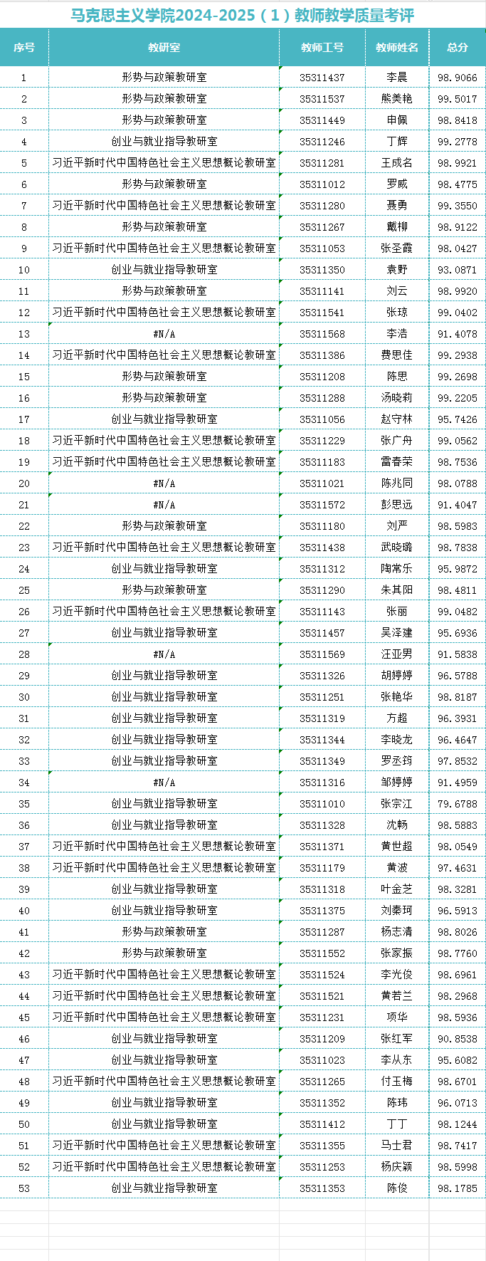 根据《万象城体育awcsport教师教学质量考核评价办法(修订)》(校教[2024]2号),马克思主义学院按要求汇总学生评价、同行评价、教师履行教学工作规范考评、教学单位评价分数,通过加权求和计算出教学评价成绩(见附表),现在本单位内部公示3个工作日(2025年2月25日-2月27日),如有异议,请在公示期内书面向马克思主义学院反映,邮箱:ahgfmy@163.com。逾期不予受理。