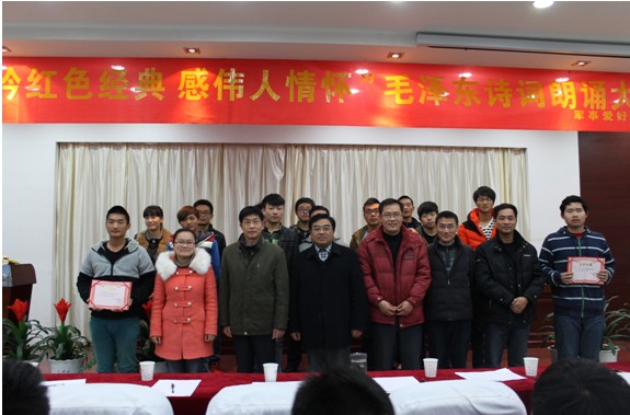 为纪念毛泽东同志诞辰120周年,12月14日下午,由思政部军事爱好者协会举办的“吟红色经典,感伟人情怀——纪念毛泽东同志诞辰120周年诗词朗诵比赛”在报告厅落下帷幕。16名参赛选手各显所长,尽情抒怀,为现场师生奉献了一场精彩的演出。