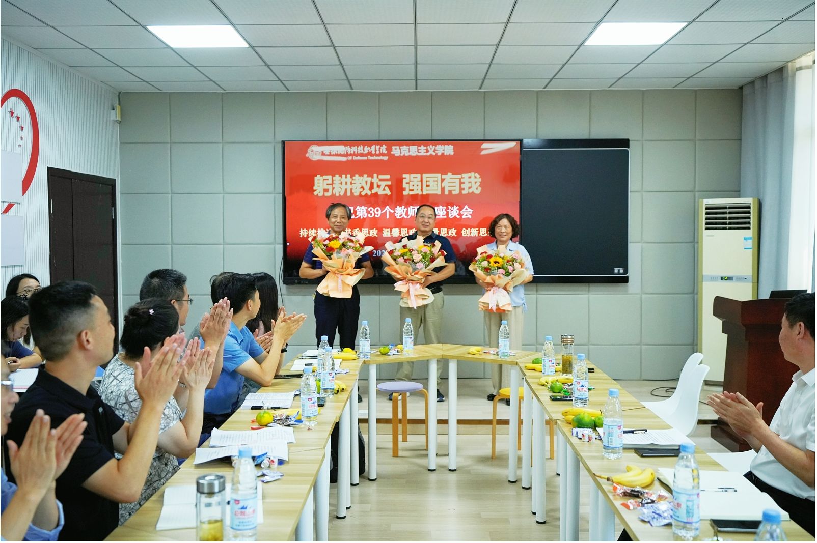 接着,马克思主义学院新进青年教师依次分享了入职感受和对教师职业的认知,并带来了《永远的追梦人》诗歌朗诵节目,一起共勉,共同为教育事业做永远的追梦人。为表达敬意,青年教师代表向光荣从教30年教师们献上了鲜花和祝福。为激励青年教师努力奋斗,发扬老教师“传、帮、带”的引领作用,光荣从教30年的教师为青年教师赠送了书籍,勉励青年教师继续传承、发扬好国防学院人的精神品质,继续开创美好的未来。