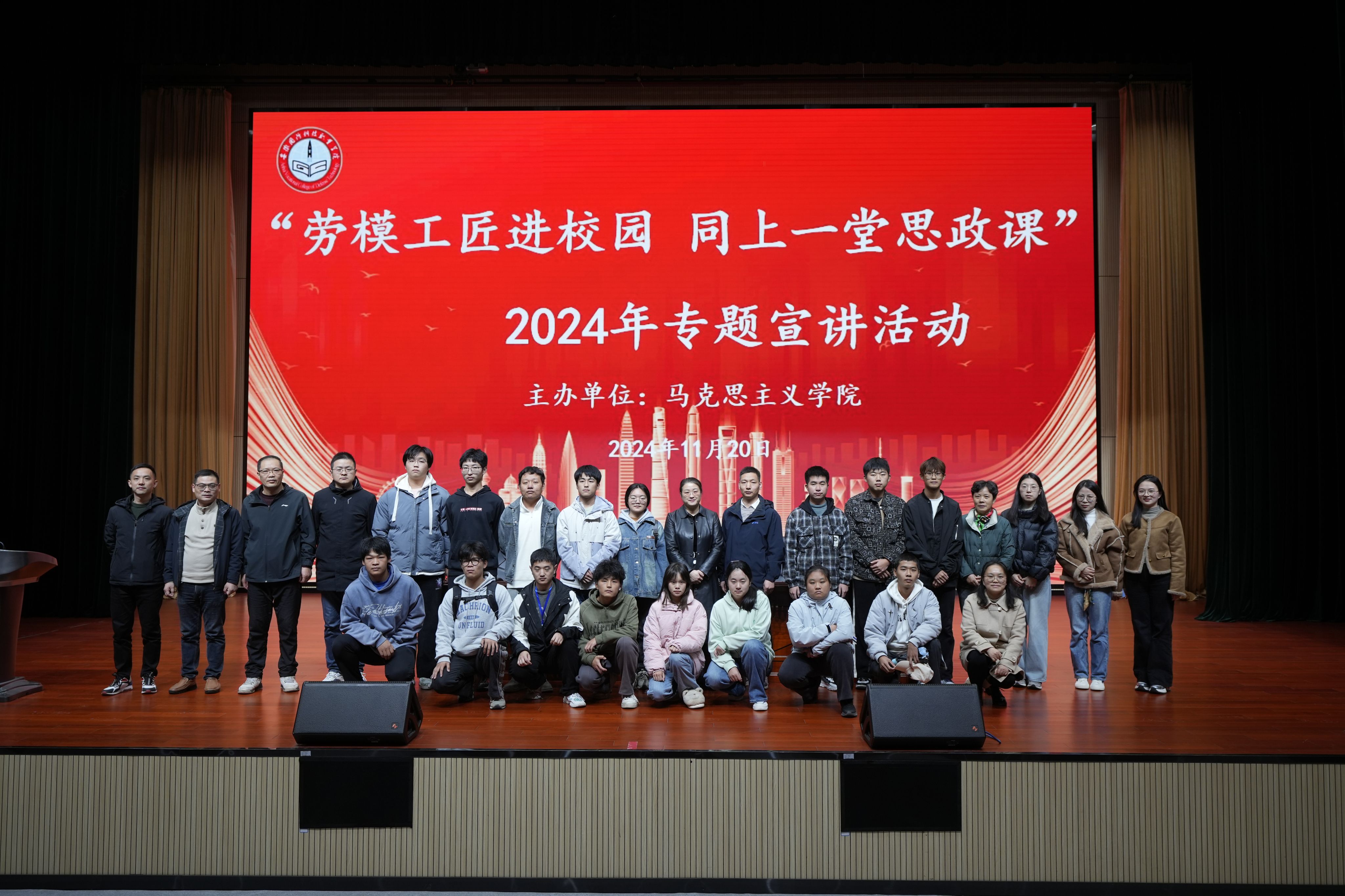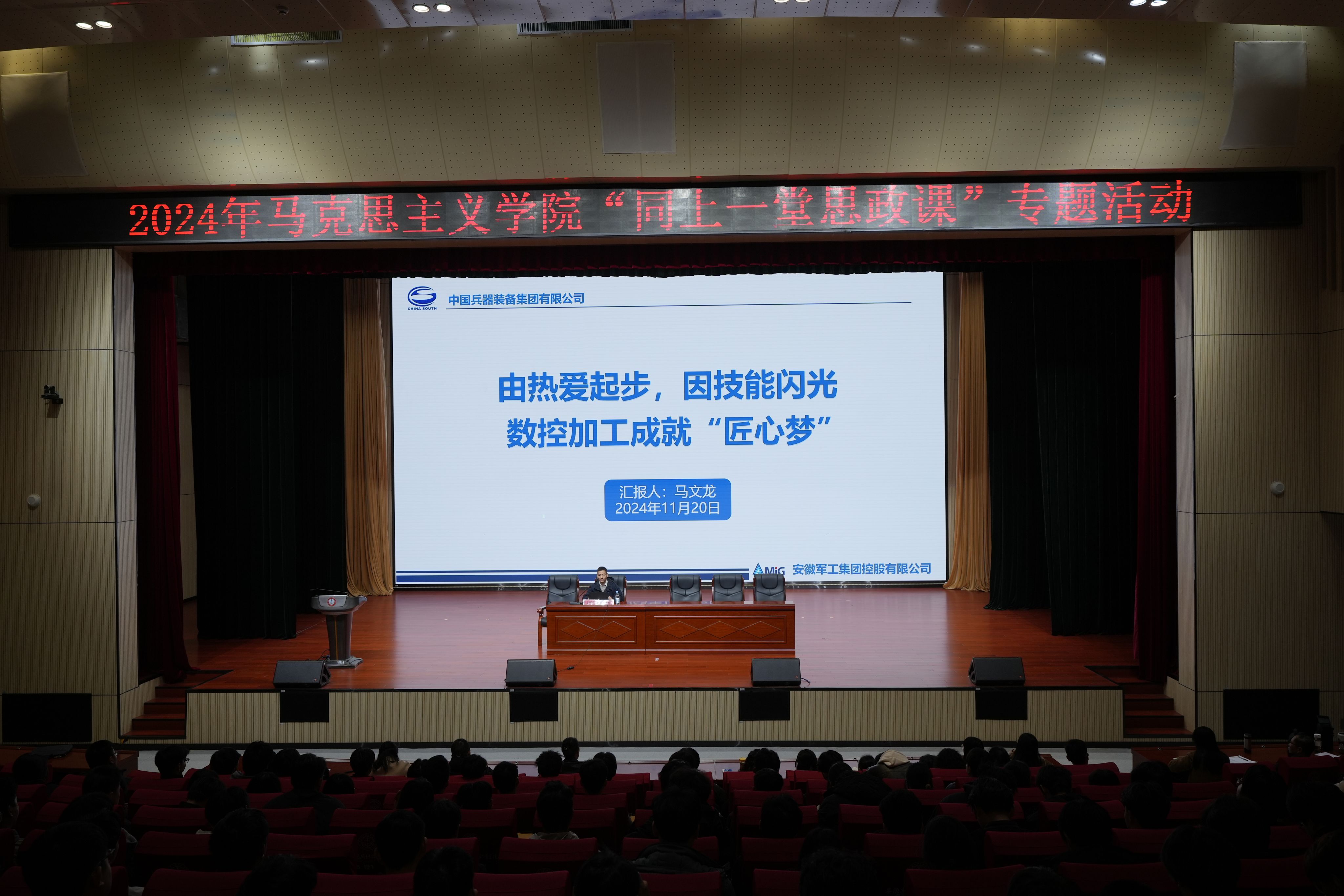 为深入学习贯彻党的二十届三中全会精神,把劳模精神、工匠精神、劳动精神融入课堂,激励万象城官网青年学生多学知识、苦练本领,走技能成才、技能报国之路。11月20日下午,由马克思主义学院主办的“劳模工匠进校园 同上一堂思政课”宣讲活动在产教融合中心多功能报告厅举行。本次宣讲活动邀请了安徽省技术能手、安徽省五一劳动奖章获得者马文龙高级技师主讲,校党委委员、宣传部部长、马克思主义学院院长陈思和全体思政课教师及2024级近500名学生代表参加了宣讲活动,活动由马克思主义学院副院长聂勇主持。