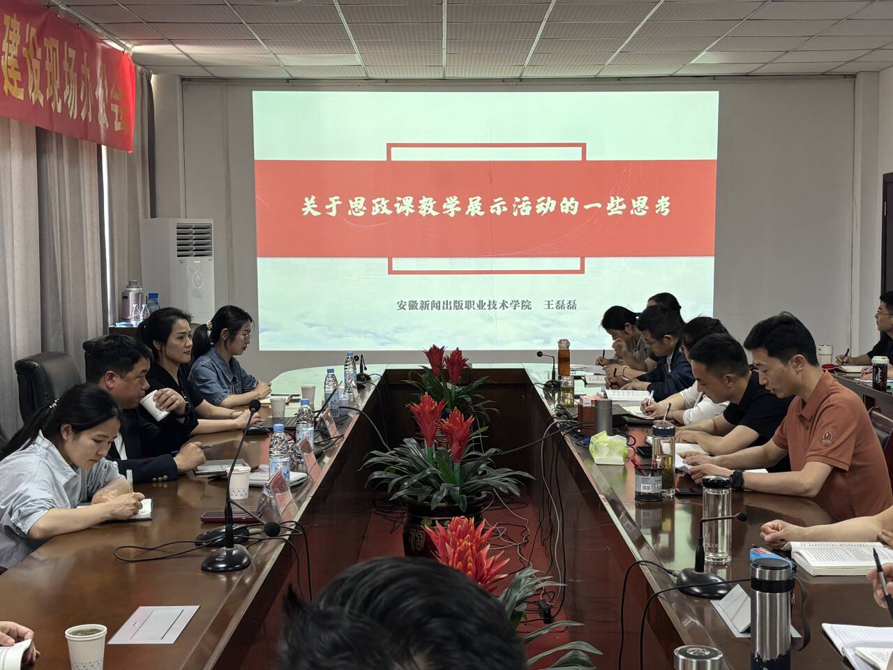 本网讯(马克思主义学院 熊美艳) 5 月 7 日 下午,马克思主义学院于 403 会议室召开思政课教师教学展示培训会,培训会由习近平新时代中国特色社会主义思想概论教研室承办。安徽新闻出版职业技术学院马克思主义学院王磊磊副教授教授等四位专家受邀出席,为学院思政课教师传授全国、安徽省思政课教师教学展示备赛经验。会议由教研室主任王成名老师主持,校党委委员、宣传(统战)部部长、马克思主义学院院长陈思、马克思主义学院副院长聂勇及全体思政课教师参会。