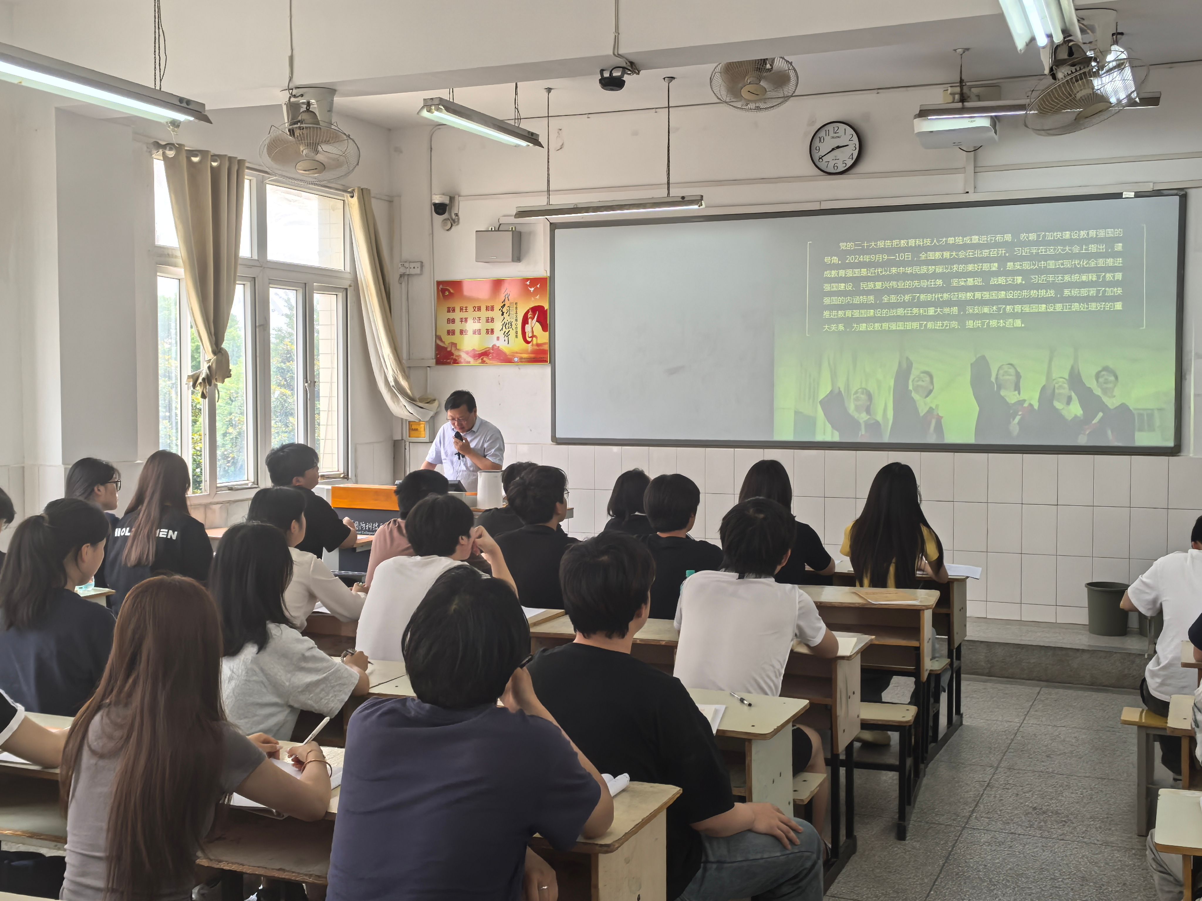 5月22日,校党委书记余嗣元深入课堂,分别为24建设工程1班、24级轨道交通3班讲授“加快推进教育强国建设”专题。余嗣元从新时代我国教育发展的历史性成就和格局性变化、教育强国的科学内涵、教育强国面临的形势与挑战、加快建设教育强国的战略举措等四个方面进行讲授,并结合《教育强国建设规划纲要(2024—2035年)》的要求,为学生们解读了中国特色社会主义教育强国的三大属性、五个重大关系、六大特质、八大体系及九方面重点任务等内容。