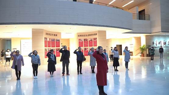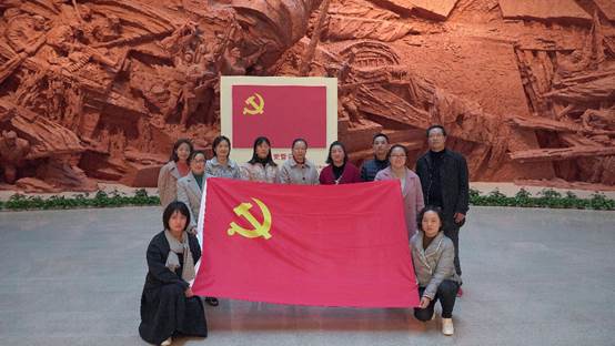 参观结束后,大家来到纪念馆广场一起瞻仰了革命先烈的塑像并集体合影留念,接着所有党员老师在思政部副主任陈思的带领下,面向鲜红的党旗,庄严地举起右拳,重温入党誓词,铮铮誓言,彰显忠诚。