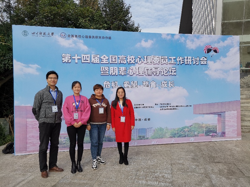 11月14日,由中国心理学会心理危机干预工作委员会和全国高校心理委员研究协作组主办,四川师范大学、全国高校心理委员工作平台承办的“第十四届全国高校心理委员工作研讨会暨朋辈心理辅导论坛”在四川师范大学召开。万象城官网思政部心理健康教育中心组织二级学院心理工作辅导员许凤麟、马士君、康垚、郑文兴等参加了此次大会。