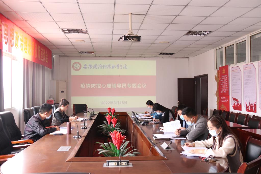 为了筑牢疫情期间的心理健康防线,减轻疫情所致的心理影响和心理伤害,保护学校全体师生的身心健康,促进校园和谐稳定,2022年3月16日下午2:00, 心理健康中心召开疫情期间心理辅导员专题会议。校党委委员、宣传部部长、马克思主义学院院长陈思、副院长聂勇参加了会议。会议由心理健康中心主任戴柳主持,心理健康中心费思佳老师、各二级学院心理辅导员参加了会议。