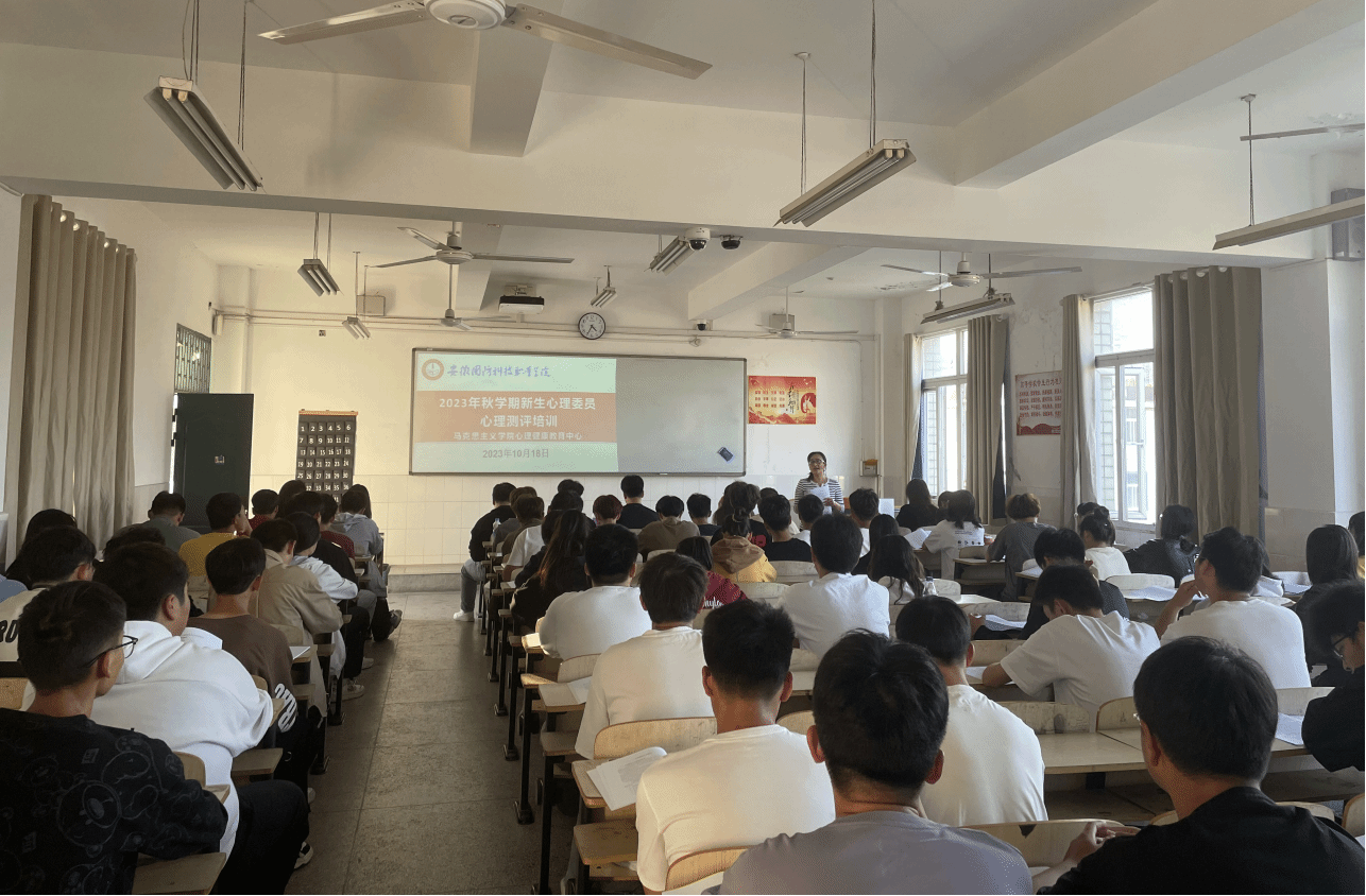 本网讯(马克思主义学院 费思佳)为了完善和规范班级心理委员队伍,做好2023年大学生心理健康测评工作,10月18日下午,心理健康教育中心在二教310教室召开2023年秋学期新生班级心理委员心理测评培训会,培训由心理健康教育中心主任戴柳主持,心理健康教育中心心理咨询员费思佳和各2023年应测班级的心理委员参加了培训。