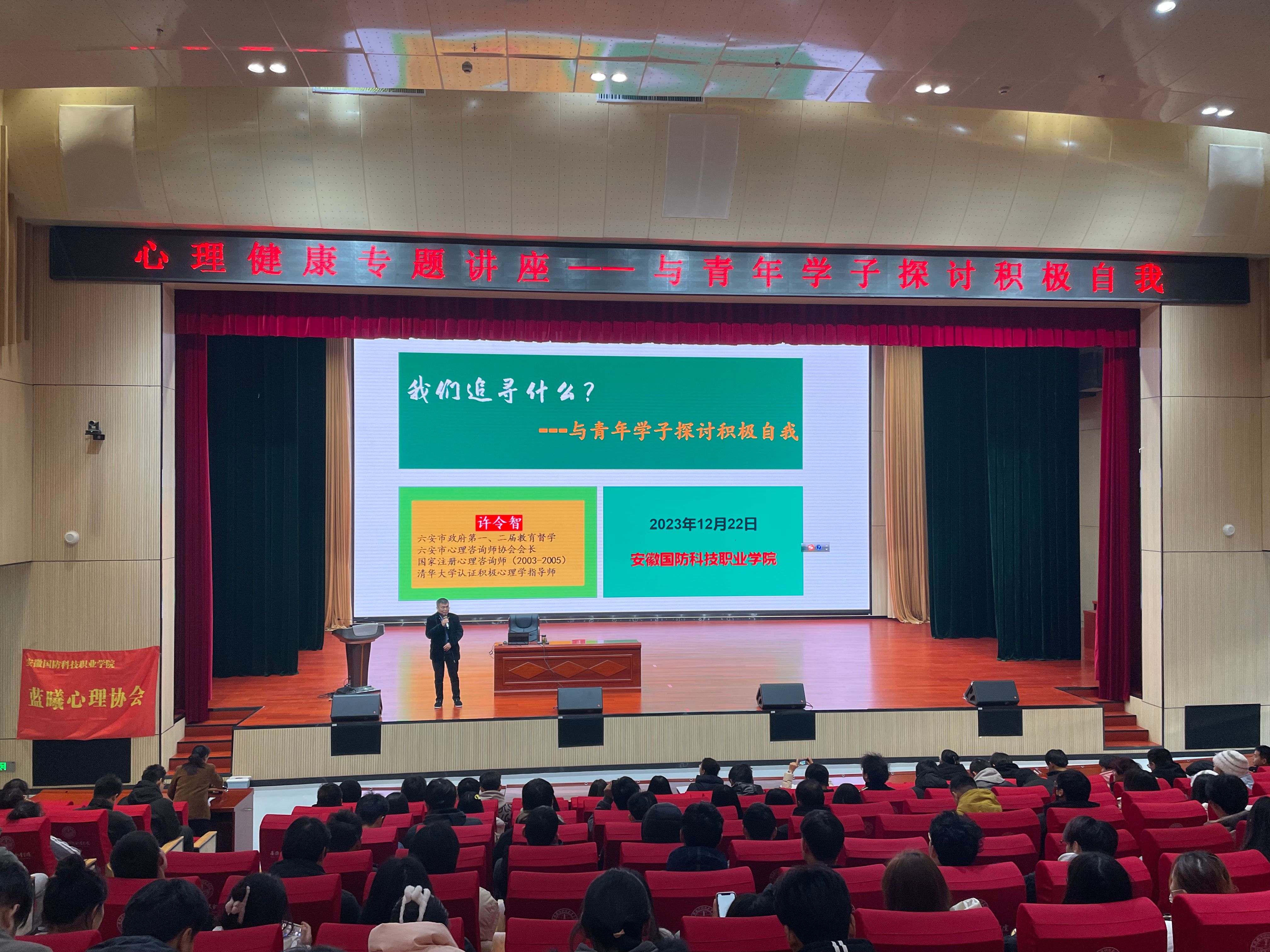 本网讯(马克思主义学院 戴柳)为了向大学生传播心理健康知识和理念,帮助同学们客观全面认识自我,提高学生的心理健康素养,12月22日下午,万象城官网在产教融合中心多功能报告厅举办心理健康知识讲座。本次讲座主题:我们追寻什么?--与青年学子探讨积极自我。此次讲座由心理健康中心主任戴柳主持,校党委委员、宣传部部长、马克思主义学院院长陈思、全体心理健康课教师、500余名学生代表参加,蓝曦心理协会做好了会务服务工作。