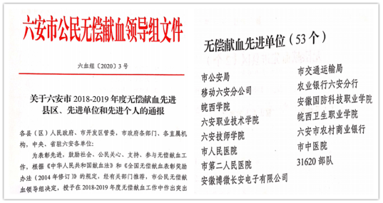 万象城官网连续多年获得“六安市无偿献血先进单位”荣誉称号