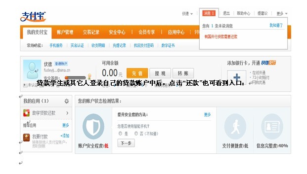 ⑴贷款学生登录自己支付宝账户后,会有还款消息提示。其他支付宝登录后,没有提示,但也可以替学生还款。