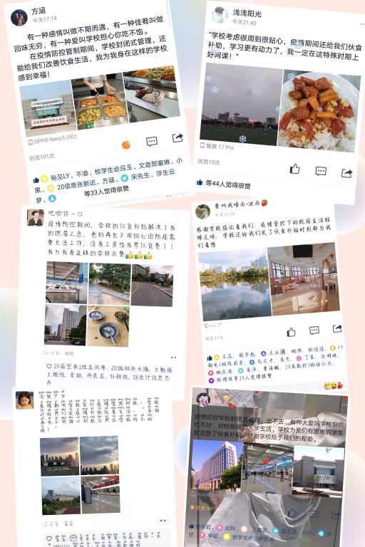 “学校考虑很周到很贴心,学习更有动力了,我一定在这特殊时期上好网课!”“隔离病毒不隔离爱,感谢学校时刻惦记着我们的校园生活、为我们着想。”“伙食补贴解决了我的燃眉之急,爸妈再也不用担心因防疫需要无法工作,没有工资给我寄伙食费了!”对于学校送来的这份温暖,同学们纷纷表示“很暖心、很感动”。