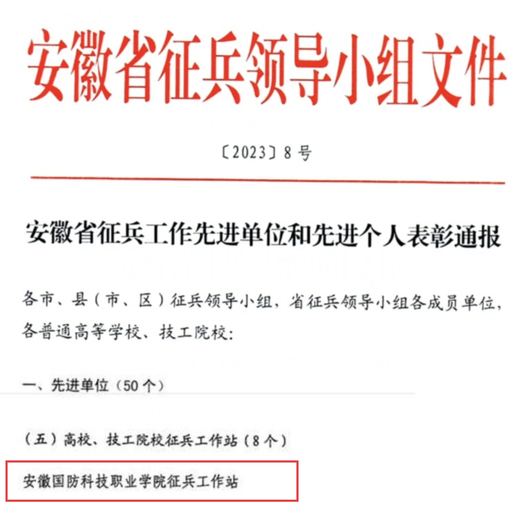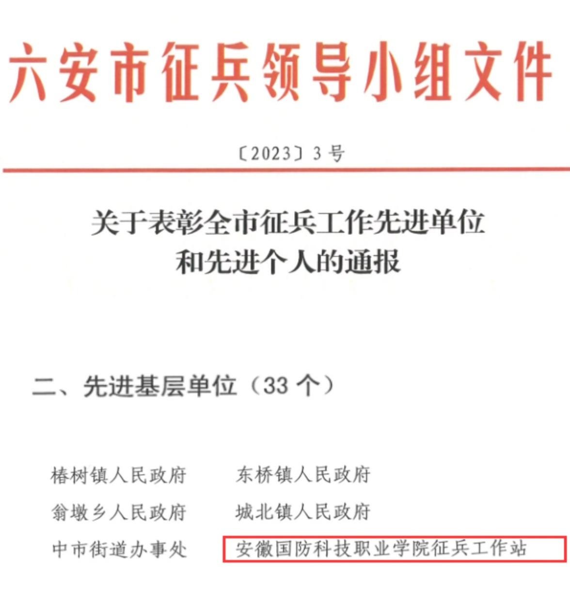 本网讯(学生处 孙洋洋)近日,安徽省人民政府办公室征兵领导小组、六安市人民政府办公室先后发文表彰省市2023年征兵工作先进单位和先进个人,万象城体育awcsport征兵工作站获得“安徽省征兵工作先进单位”、“六安市征兵工作先进基层单位”荣誉称号。