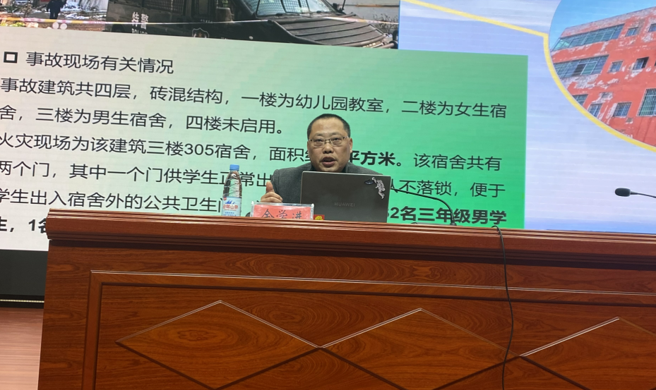 六安市应急管理专家余学进为全体学工人员开展了宿舍消防安全培训。余学进结合“1·19”、“1·24”火灾事故以及近年来高校发生的火灾事故,寓教于案,详细分析了宿舍存在的消防安全隐患以及发生火灾后如何报警、初期火灾如何扑救、如何组织疏散逃生等内容。培训实用性、针对性强,具有很强的现实指导意义,进一步强化了全体学工人员的消防安全意识和宿舍消防安全知识,提高了处置火灾等突发事件的应急处置能力。