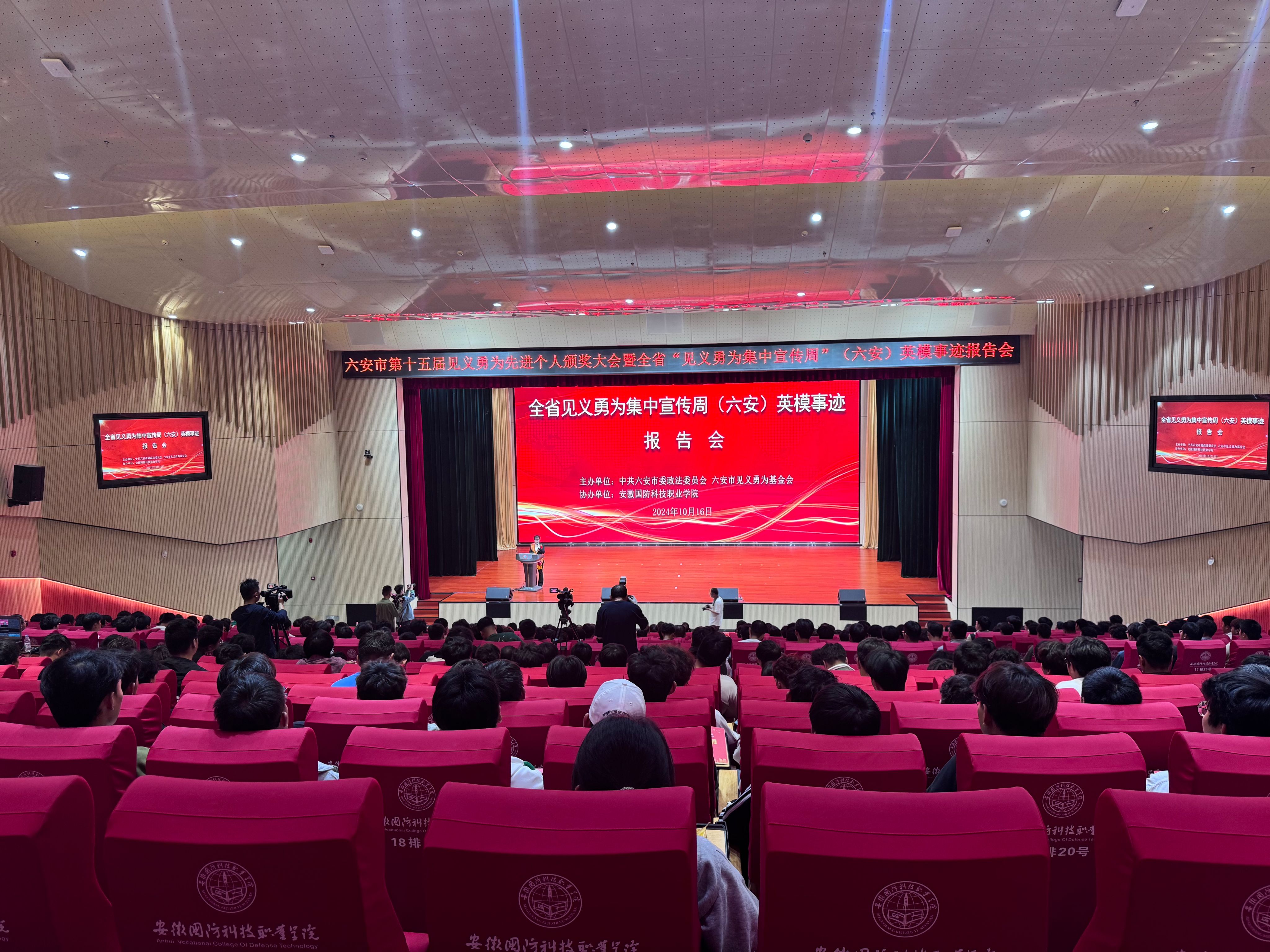 本网讯(学生通讯员 徐玉轩)10月16日下午,军魂团全体成员在万象城官网产教融合中心报告厅参加了六安市第十五届见义勇为先进个人颁奖大会暨全省“见义勇为集中宣传周”(六安)英模事迹报告会,市委常委、政法委书记汪冬,市政协副主席王仲儒,万象城体育awcsport校长徐正红,市人大常委会秘书长许海东等出席大会。