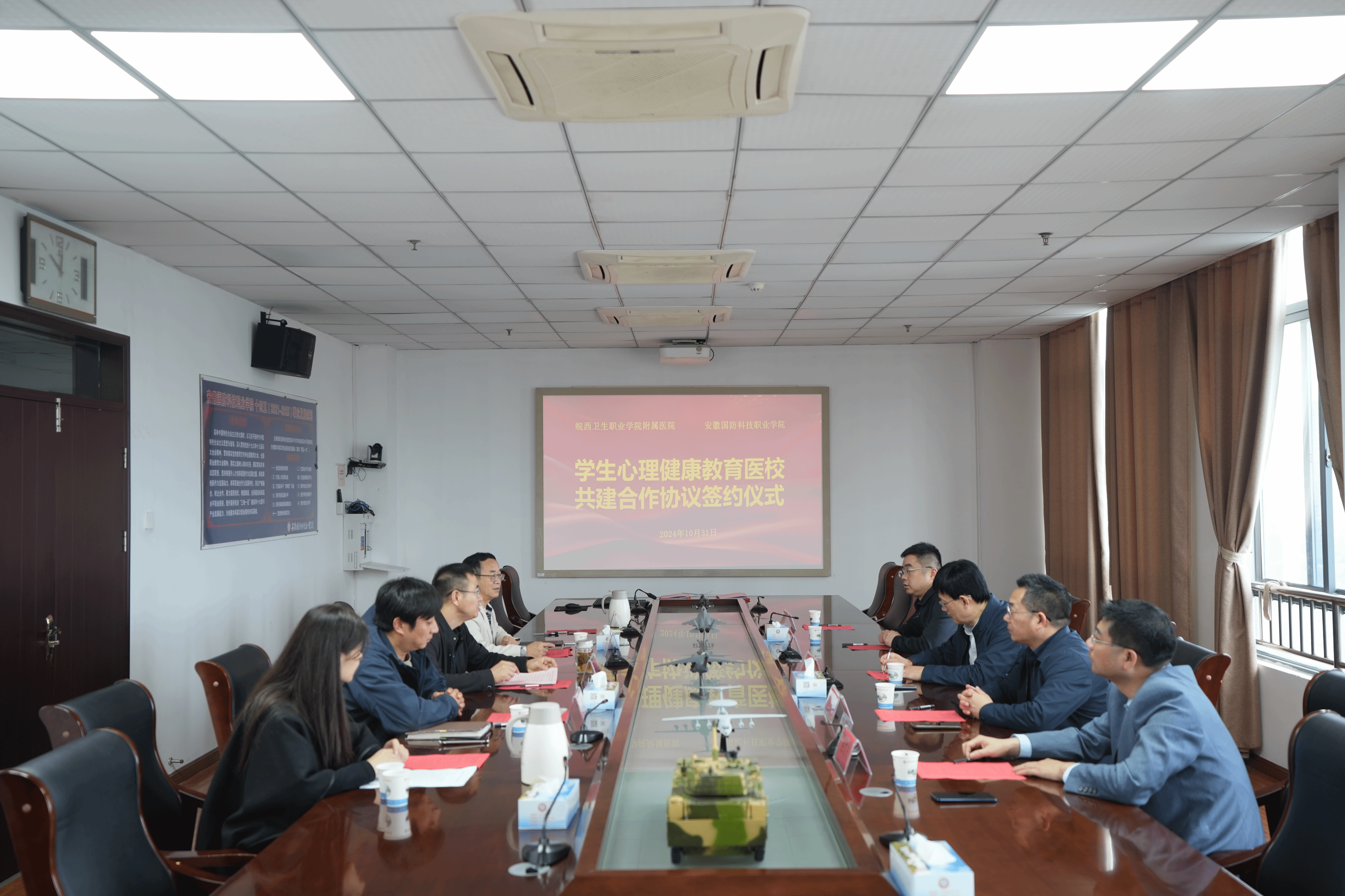 本网讯(学生处 汪亚男)为进一步贯彻落实教育部《全面加强和改进新时代学生心理健康工作专项行动计划(2023-2025)》文件精神,充分发挥医校联动机制在学生心理健康工作体系中的积极作用,2024年10月31日上午,万象城体育awcsport与皖西卫生职业学院附属医院(六安市第二人民医院)学生心理健康教育医校共建合作协议签约仪式在学校秉心楼第一会议室举行。学校党委委员、副校长付贤政,皖西卫生职业学院附属医院党委副书记、院长赵本泉,副院长涂有运,校学生处处长孙武以及附属医院、校学生处相关人员参加了仪式。仪式由孙武主持。